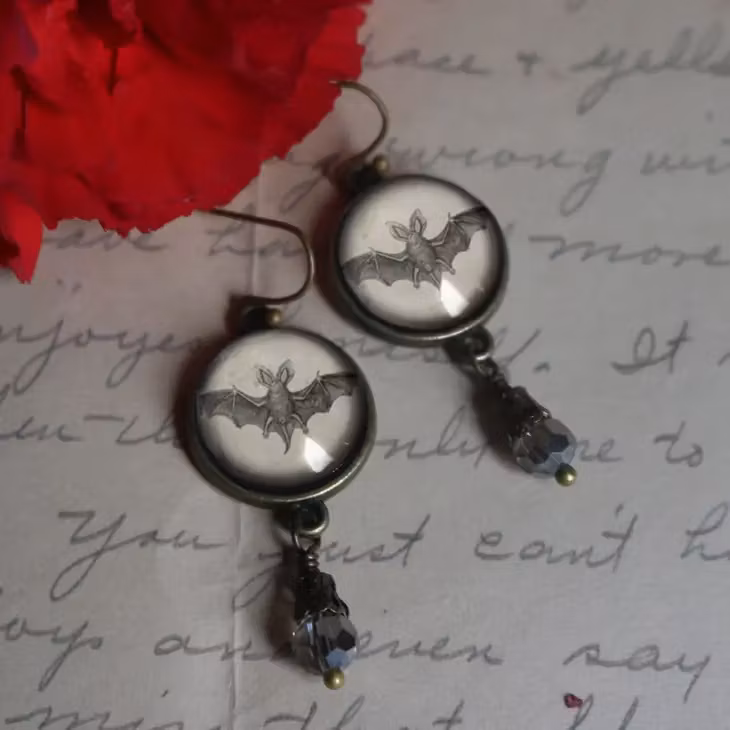 Vintageinspirerade örhängen i mässing. Örhängena har en illustration av en fladdermus under en cabochon av glas samt en liten dinglande pärla nederst.