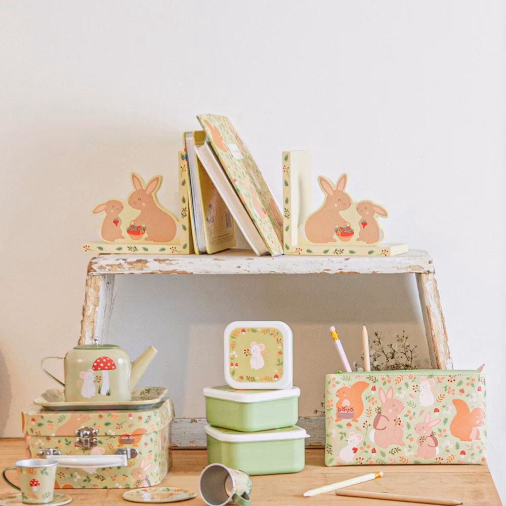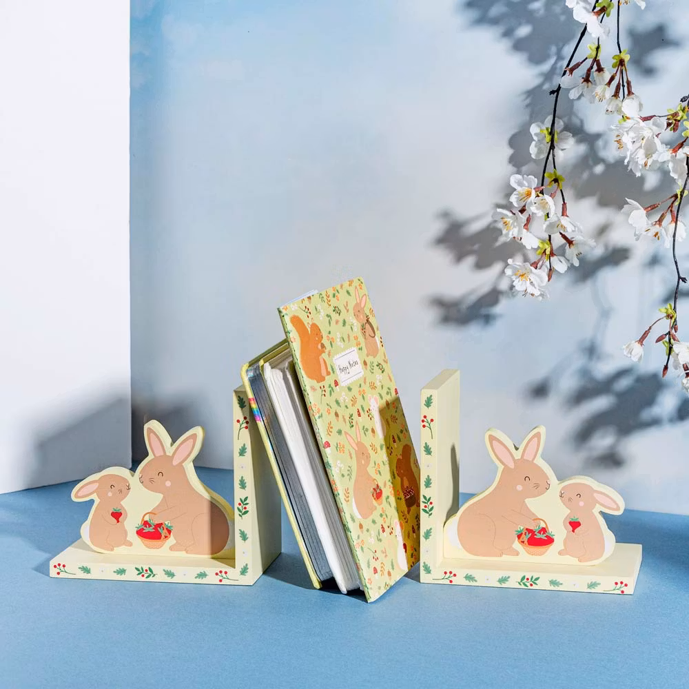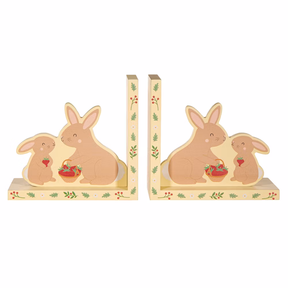 Skapa en mysig och lekfull känsla i barnrummet med dessa söta kaninbokstöd. De mjuka tonerna av ljusgrönt och taupe gör bokstöden lätta att matcha med olika färger och stilar i rummet. Perfekta för att hålla ordning bland sagoböckerna och lika fina som stöd när du vill visa upp andra små favoritprylar.