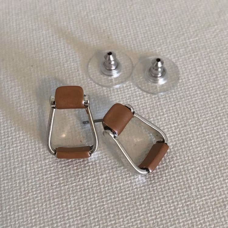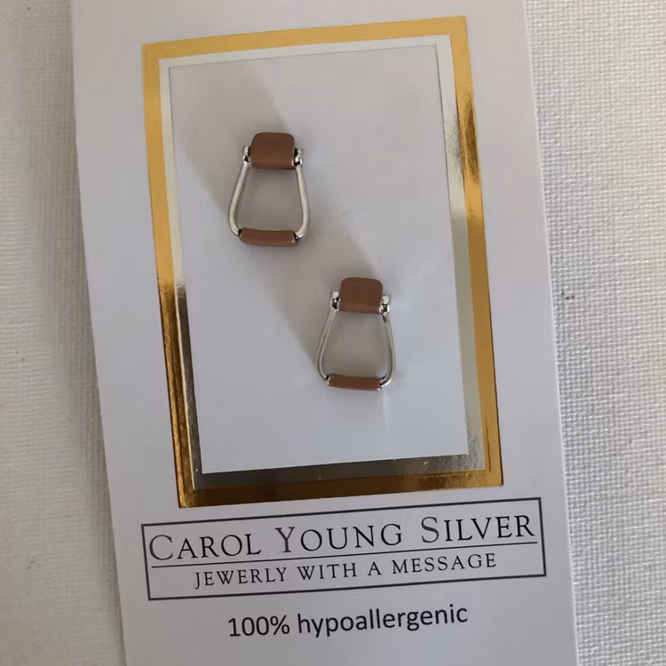 Örhängen i form av ett par stigbyglar. Örhängena är fästa på ett litet kort.