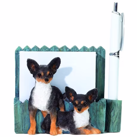 Försedd med magnet på baksidan så hållaren kan ställas på bord eller fästas på magnetisk yta. Block och penna ingår.