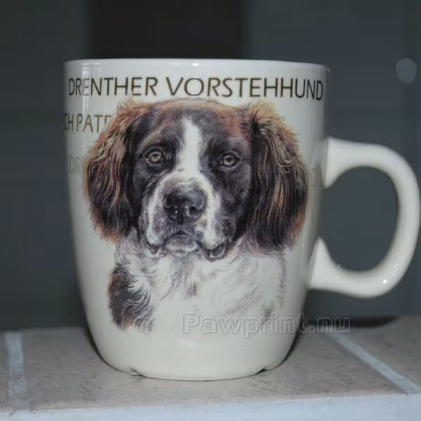 Liten mugg med en illustration av en drentsche patrijshond på båda sidor om muggen.