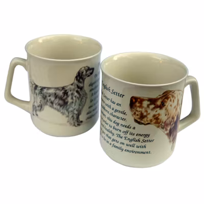Mugg med illustrationer samt engelsk text om engelsk setter.