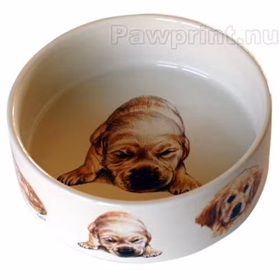 Matskål i keramik med illustrationer av Golden retriever.