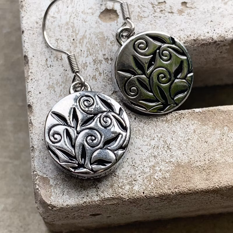 Örhängen med ett litet konstverk monterat under ett lager av resin vilket ger en klar glasliknande yta. Baksidan har ett snirkligt bladmönster i metallen.