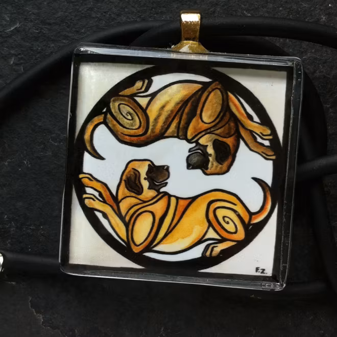 Konstverk fäst på glas tillverkat av den fantastiska konstnären Foxfeather R. Ženková från Minnesota. Hänget är uppträtt på ett svart kabelliknande snöre som fästs med hummerspänne.