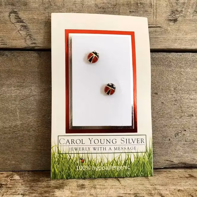 Örhängen i form av ett par nyckelpigor. Nyckelpigorna är försedda med röd och svart emalj med guldfärgade konturer. Ögonen består av två kubisk zirkonia. Örhängena är fästa på ett litet kort.
